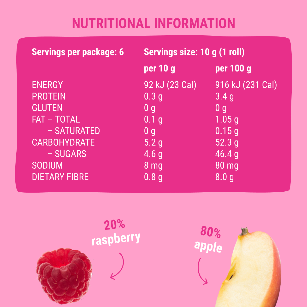 My snacks are made from 100% fruits and berries with no added sugar. They’re free from top allergens: peanuts, tree nuts, milk, eggs, soy, wheat, fish, shellfish, and sesame. No gluten or artificial ingredients. Pure fruit and nothing else!
