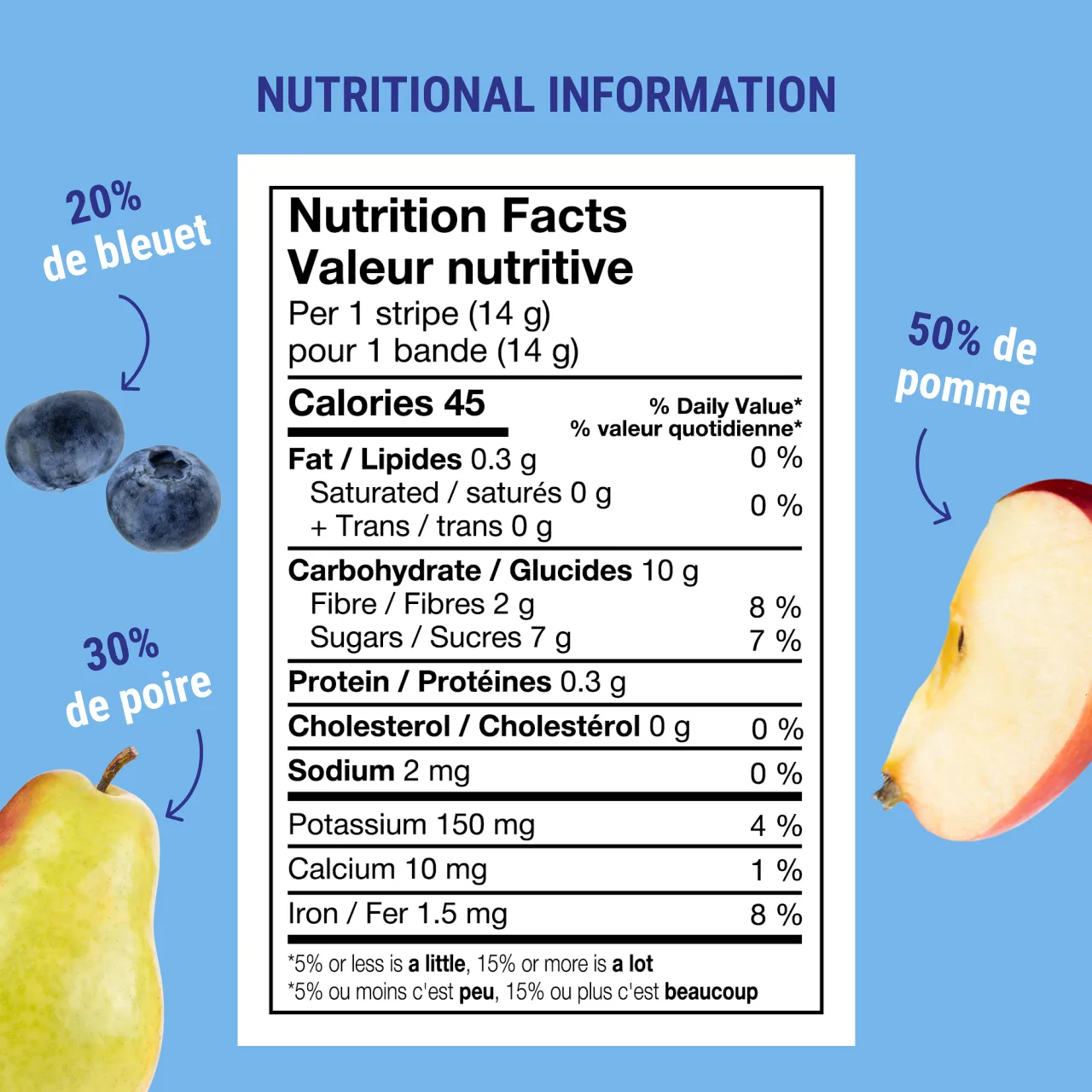 Pomme 50%, Poire 30%, Bleuet 20%.
