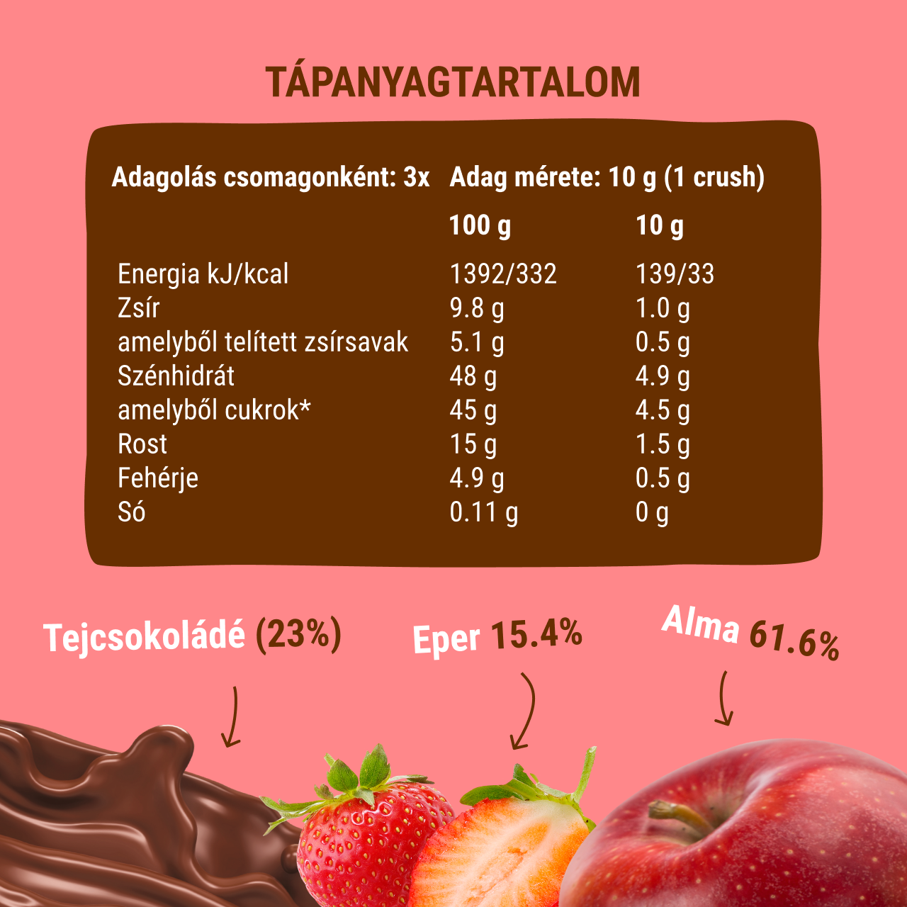 Gyümölcstöltelék (77%): alma 61.6%, eper 15.4%; tejcsokoládé (23%): rost (oligofruktóz), kakaóvaj, zsíros TEJPOR, zsírszegény TEJPOR, kakaómassza, emulgeálószer: napraforgó lecitin, természetes vanília aroma, édeítőszer: stevia kivonat. *Kakaó szárazanyag tartalom az étcsokoládéban minimum 36%. Az allergén összetevők aláhúzva.
