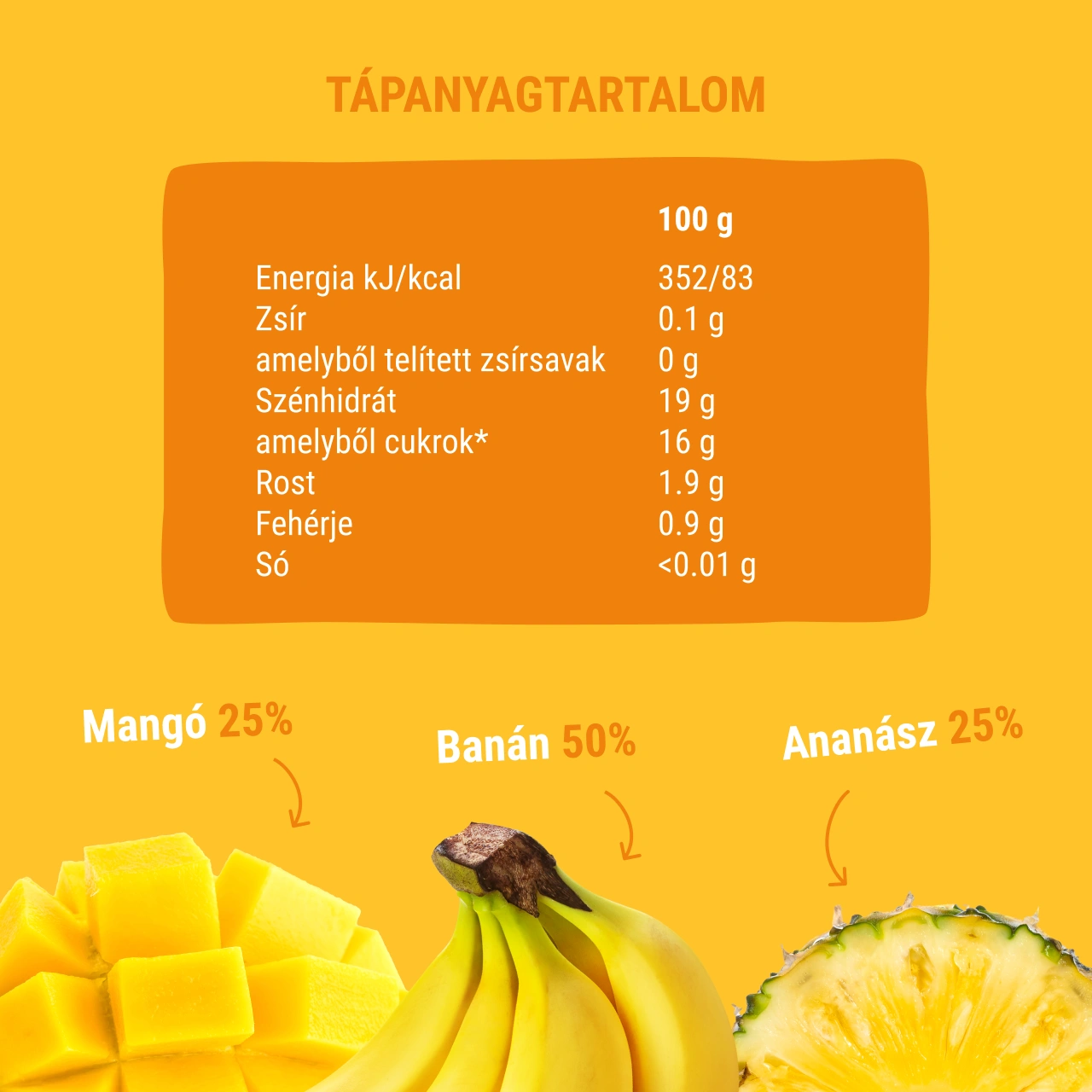 Banánpüré 50%, ananászpüré 25%, mangópüré 25%.