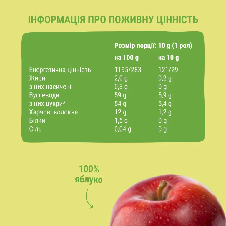 Роли виготовлені з фруктів і ягід без доданого цукру. Вони не містять основних алергенів: арахісу, горіхів, молока, яєць, сої, пшениці, риби, молюсків і кунжуту. Без глютену та штучних домішок. Всього 2-3 інгредієнти і нічого зайвого!