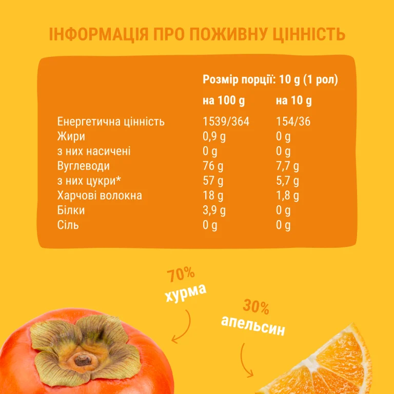 Роли виготовлені з фруктів і ягід без доданого цукру. Вони не містять основних алергенів: арахісу, горіхів, молока, яєць, сої, пшениці, риби, молюсків і кунжуту. Без глютену та штучних домішок. Всього 2-3 інгредієнти і нічого зайвого!