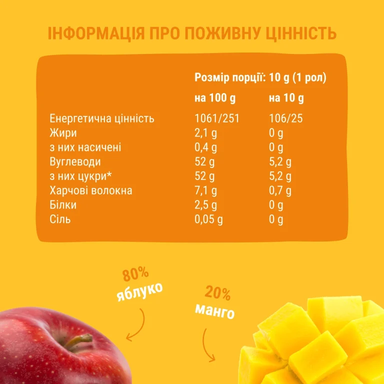 Роли виготовлені з фруктів і ягід без доданого цукру. Вони не містять основних алергенів: арахісу, горіхів, молока, яєць, сої, пшениці, риби, молюсків і кунжуту. Без глютену та штучних домішок. Всього 2-3 інгредієнти і нічого зайвого!