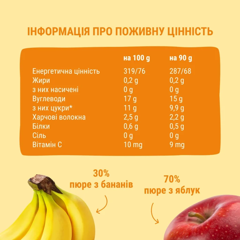 Склад: пюре з яблук 70%, пюре з бананів 30%, вітамін С.