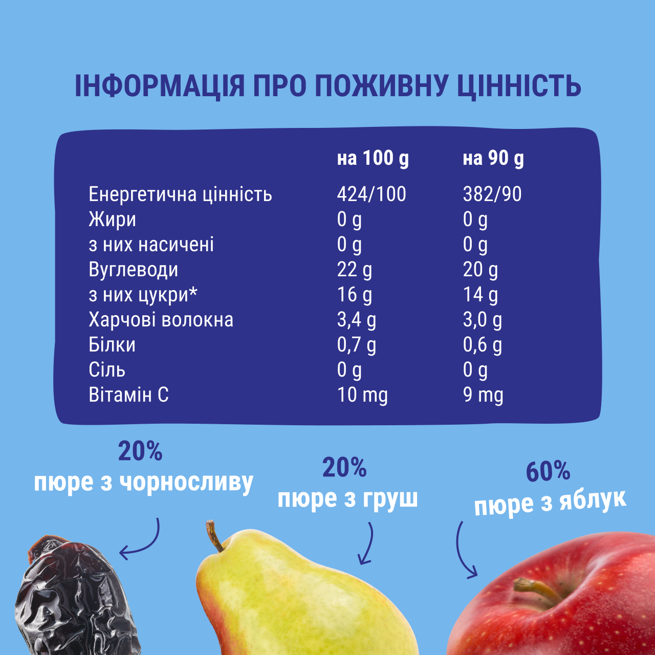 Склад: пюре з яблук 60%, пюре з груш 20%, пюре з чорносливу 20%.