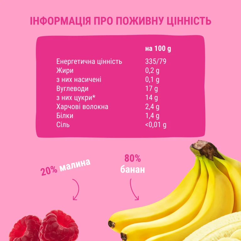 Склад: пюре з банану 70%, пюре з малини 30%.