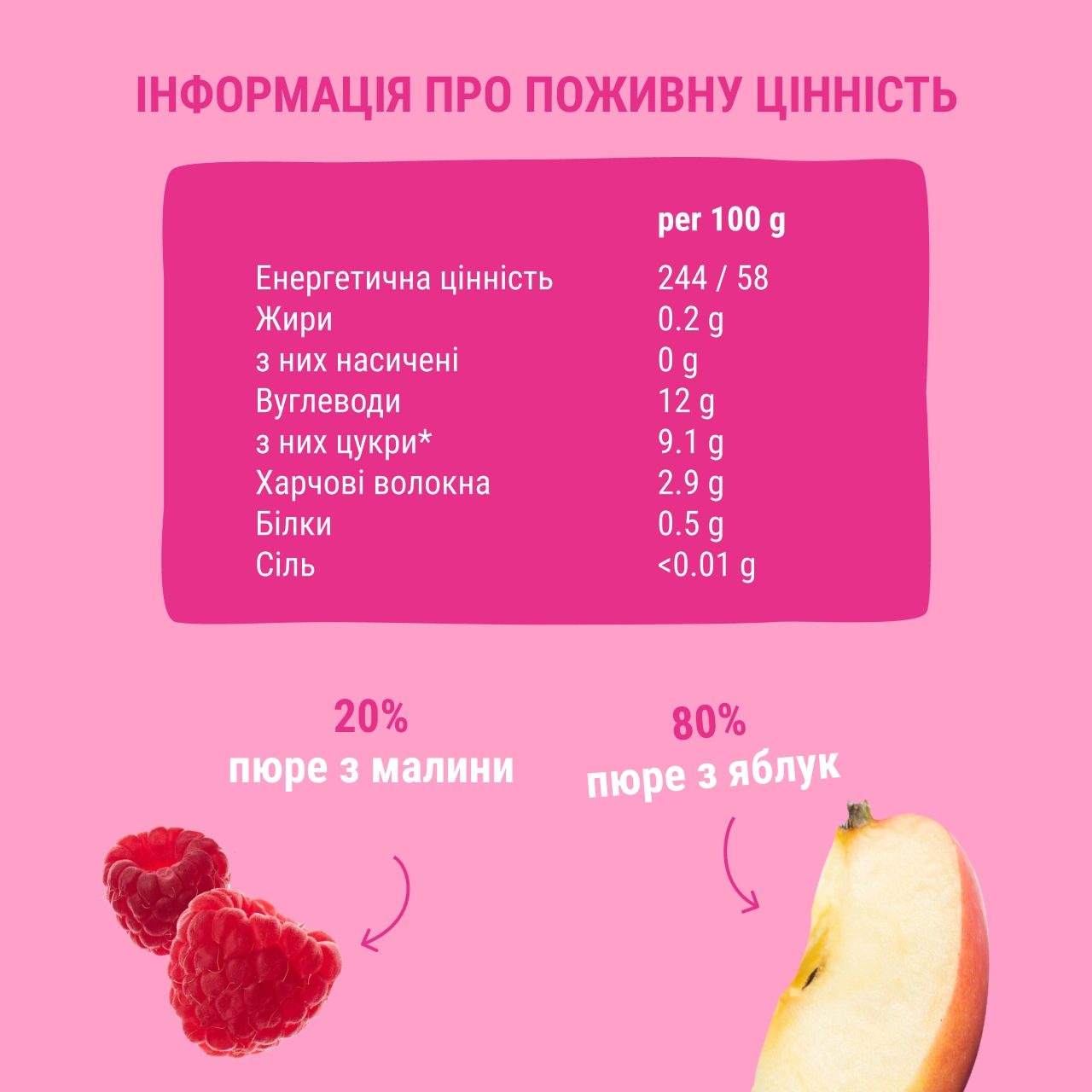 Склад: пюре з яблук 80%, пюре з малини 20%.