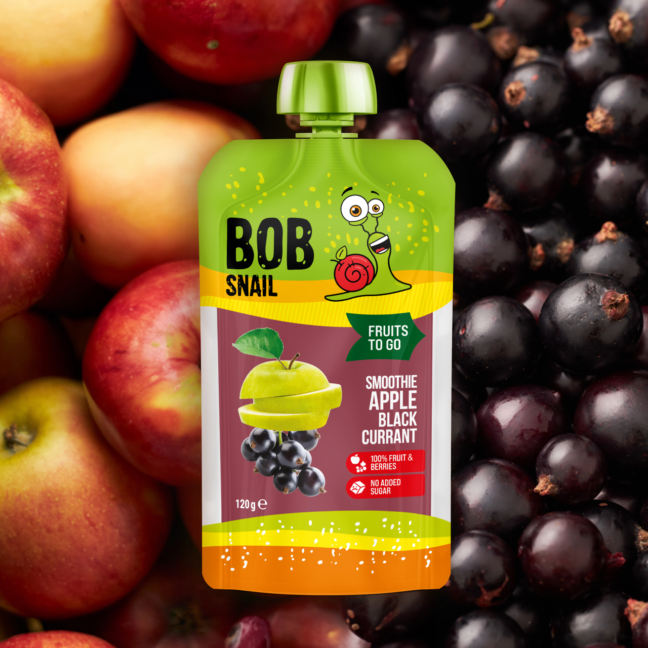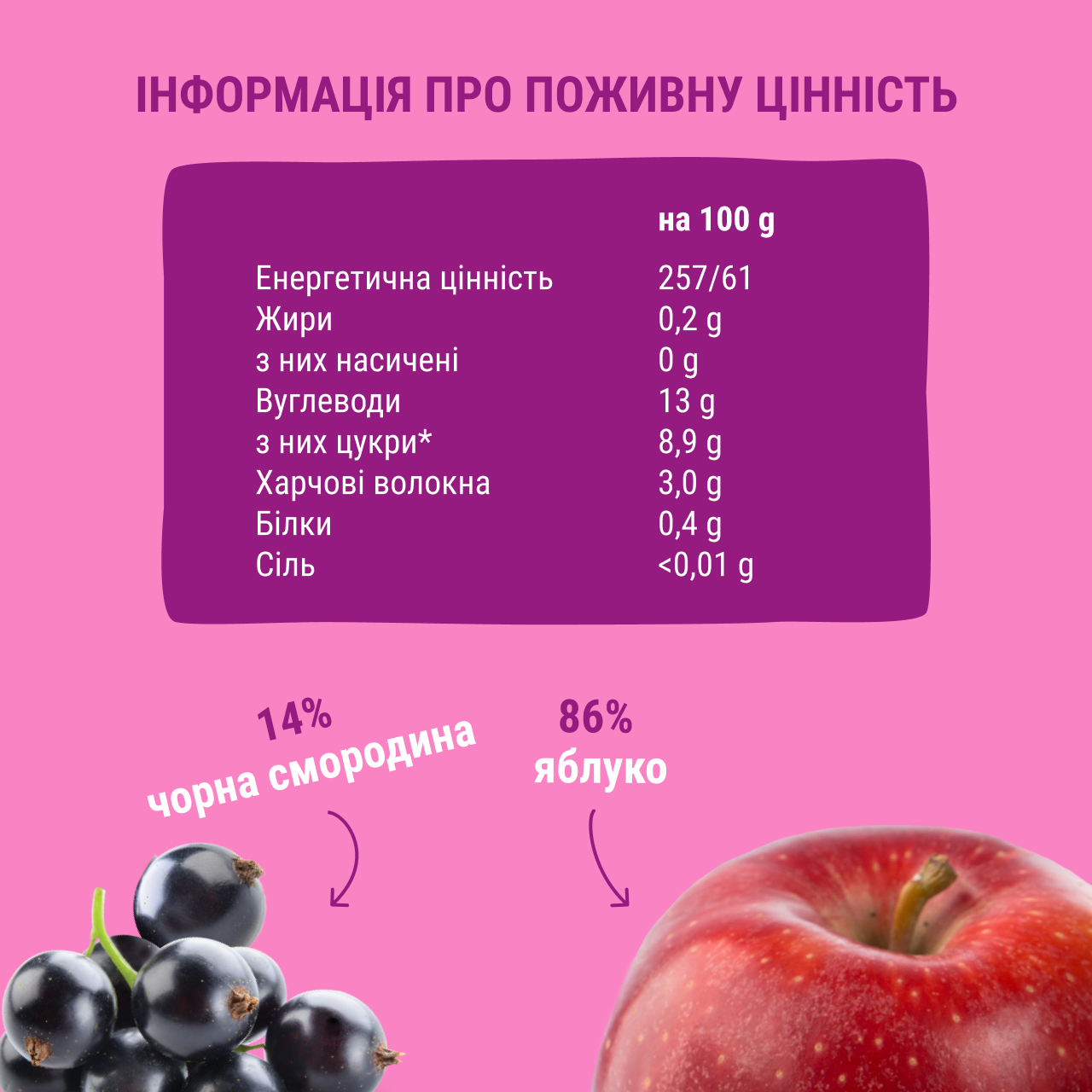 Склад: пюре з яблук 86%, пюре з чорної смородини 14%.