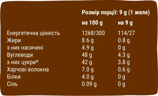 Мармелад має м’яку і водночас пружну текстуру та насичений фруктовий смак з нотками шоколаду. Перед ними неможливо встояти, та й навіщо? Ласуй із задоволенням і пригощай рідних!