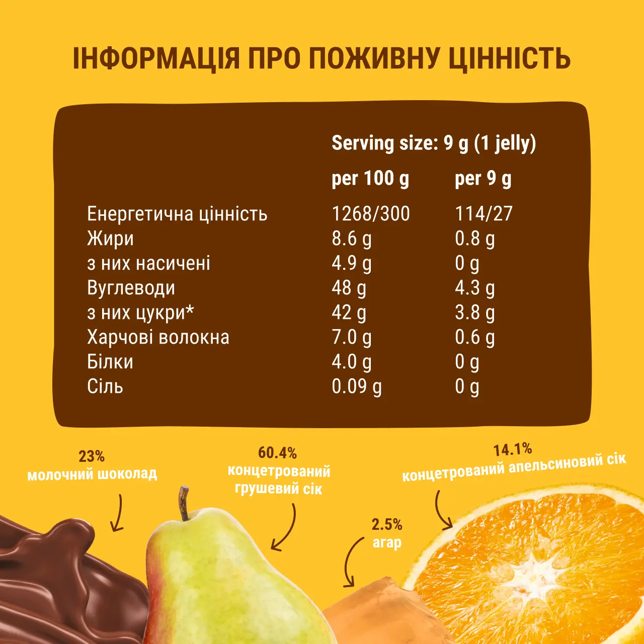 Склад: мармелад (77%): сік грушевий концентрований 60.4%, сік апельсиновий концентрований 14.1%, агар 2.5%; молочний шоколад (23%): харчові волокна (олігофруктоза), какао масло, сухе незбиране МОЛОКО, сухе знежирене МОЛОКО, какао маса, емульгатор: соняшниковий лецитин, натуральний ароматизатор ваніль, підсолоджувач: екстракт стевії.