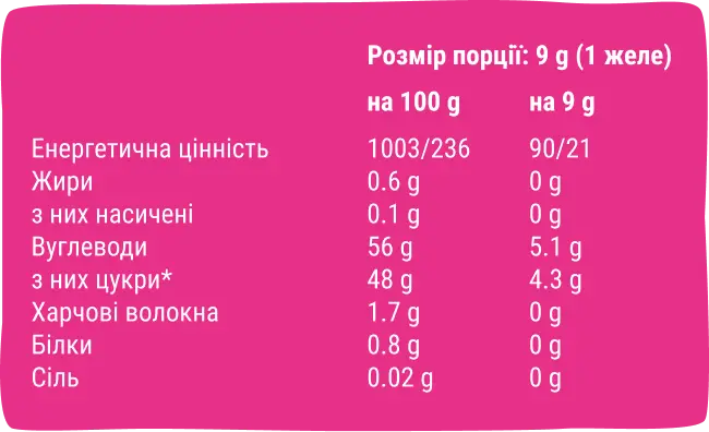Мармелад із концентрованого фруктового соку — без доданого цукру, желатину чи глютену. Містить природний загусник агар.