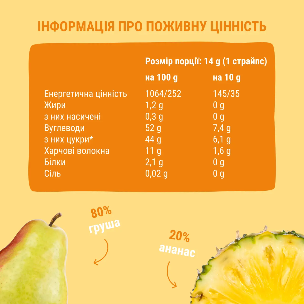 Страйпси виготовлені тільки з фруктів та ягід без доданого цукру. Підходять веганам. Ідеальні для швидкого перекусу на ходу.