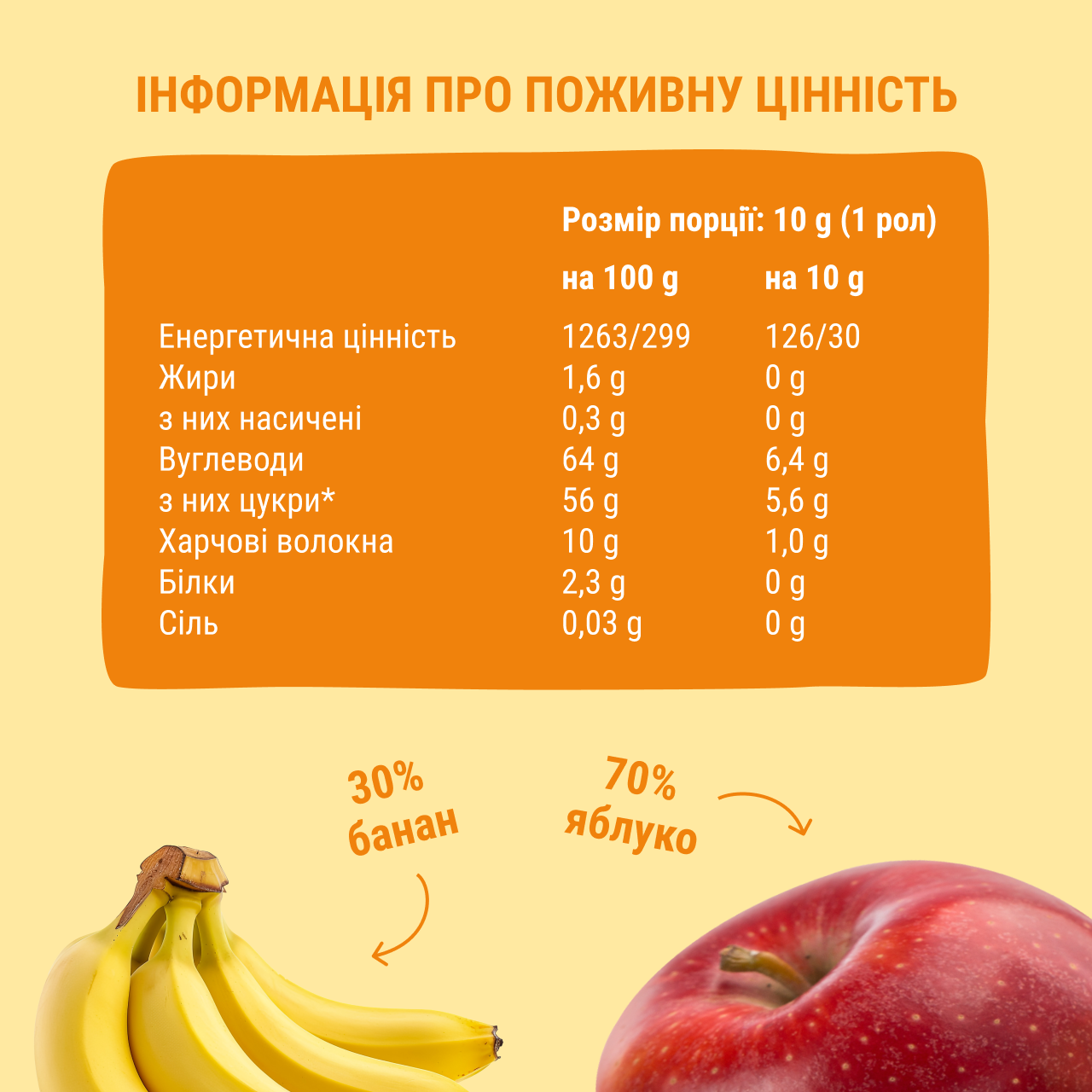 Роли виготовлені з фруктів і ягід без доданого цукру. Вони не містять основних алергенів: арахісу, горіхів, молока, яєць, сої, пшениці, риби, молюсків і кунжуту. Без глютену та штучних домішок. Всього 2-3 інгредієнти і нічого зайвого!