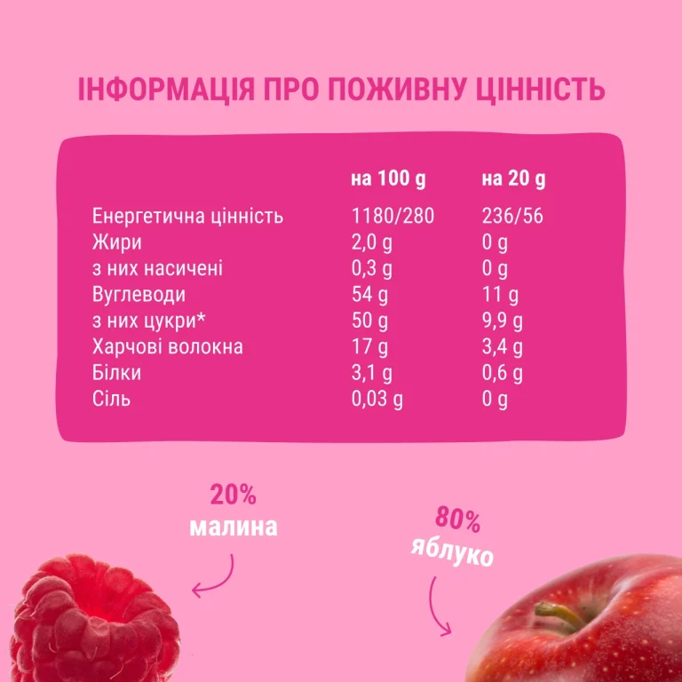 Фруктові снеки (Fruit Snack) виготовлені з фруктів і ягід без доданого цукру. Вони не містять основних алергенів: арахісу, горіхів, молока, яєць, сої, пшениці, риби, молюсків і кунжуту. Без глютену та штучних домішок. Всього 2-3 інгредієнти і нічого зайвого!