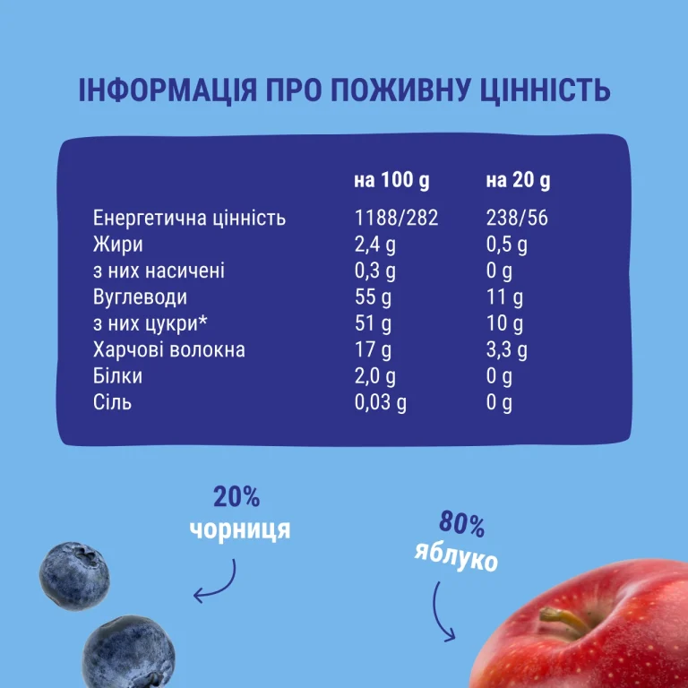 Склад: яблуко 80%, чорниця 20%.