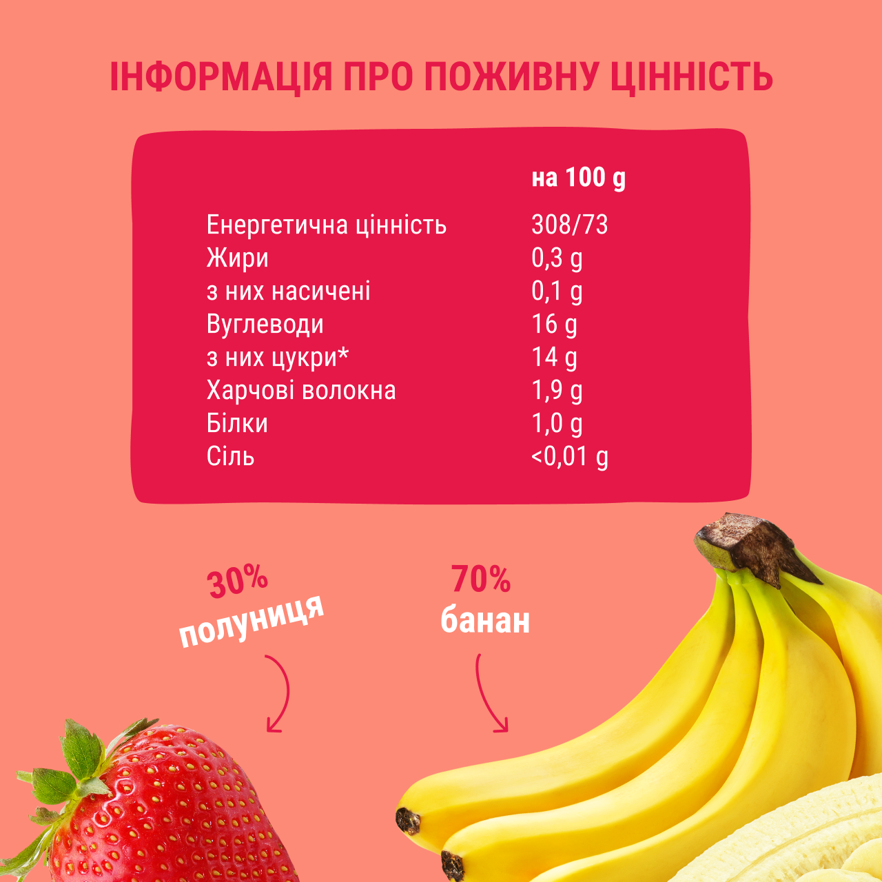 Склад: банан 69,7%, полуниця 30%, сік чорної моркви 0,3%.
