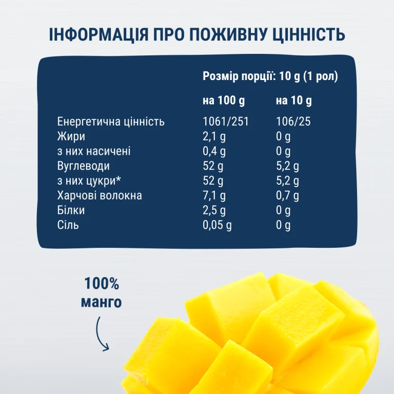 - 2 фруктові роли з манго без доданого цукру, консервантів, глютену, ГМО та барвників.