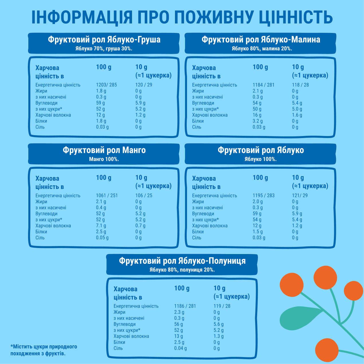 Смаколики виготовлені з фруктів і ягід без доданого цукру. Вони не містять основних алергенів: арахісу, горіхів, молока, яєць, сої, пшениці, риби, молюсків і кунжуту. Без глютену та штучних домішок.