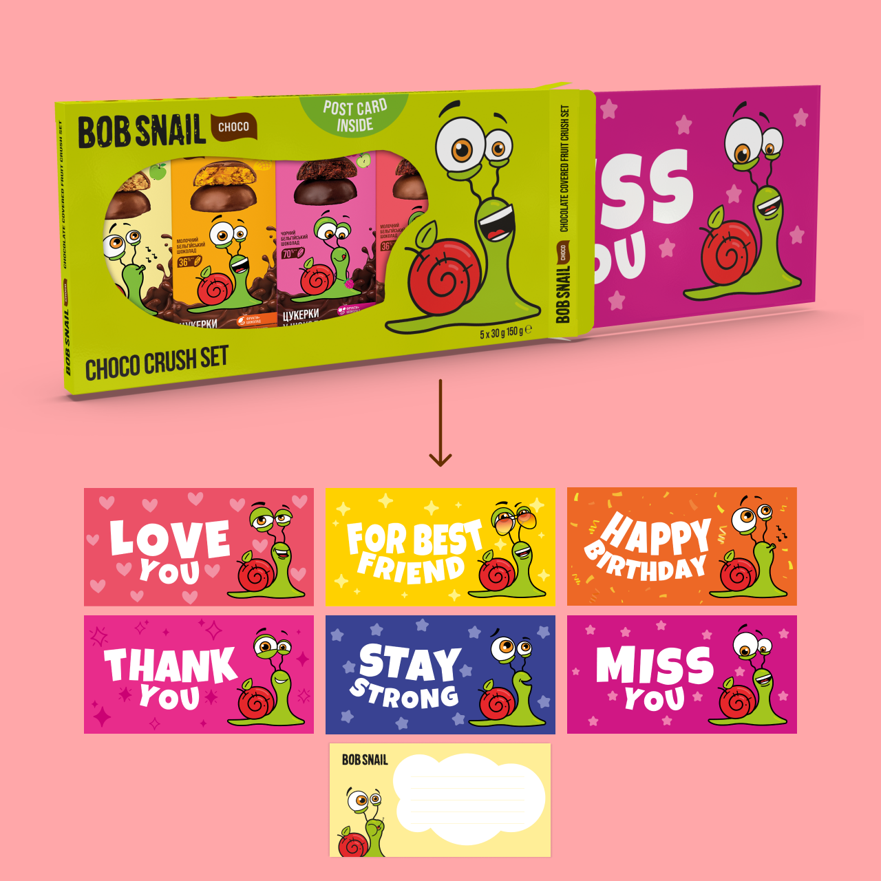 Choco Crush Set (Чоко краш сет) – це набір фруктово-ягідних цукерок в шоколаді на на всі випадки життя! Набір містить 5 різних смаків цукерок в бельгійському шоколаді та одну з 6 листівок, яку можна власноруч підписати.