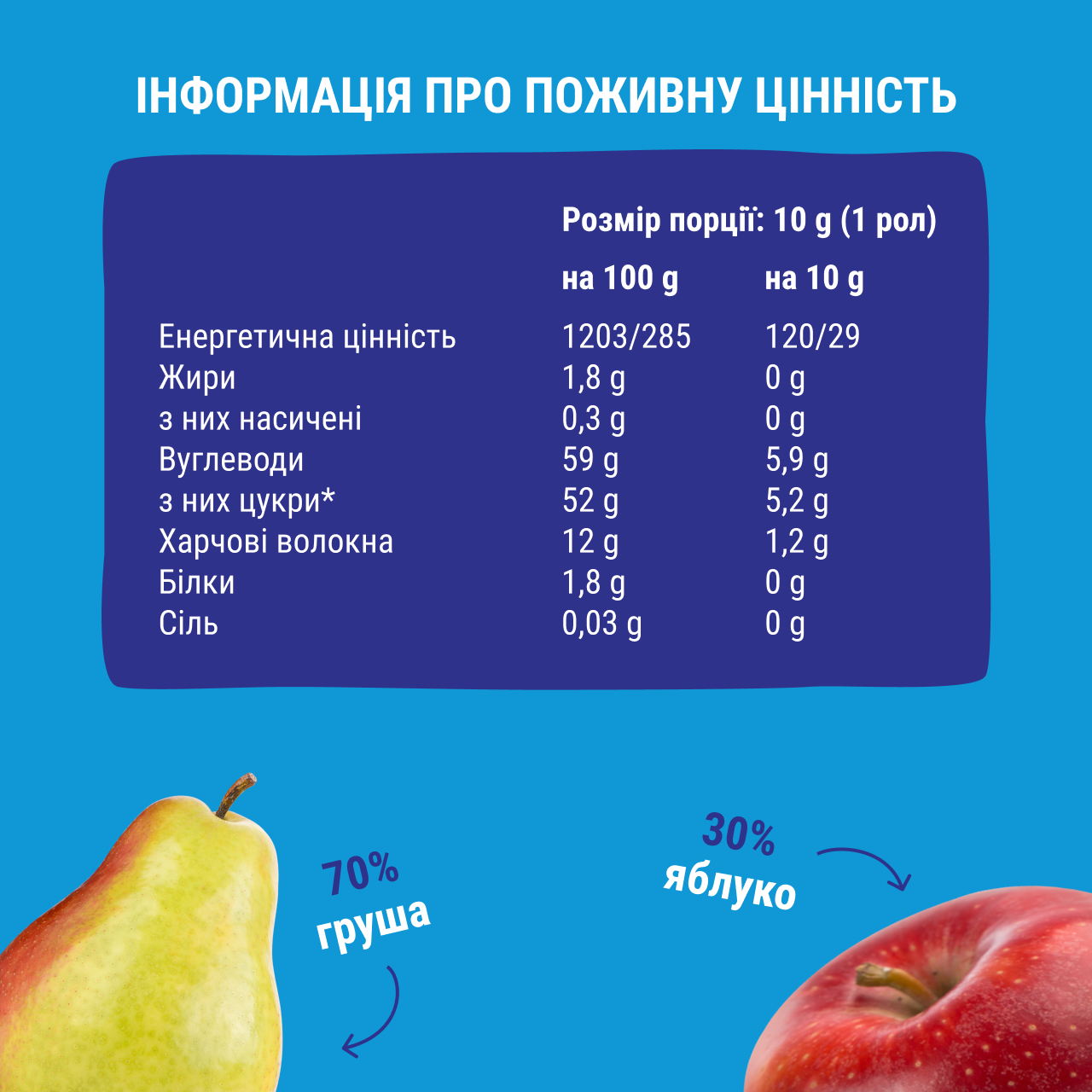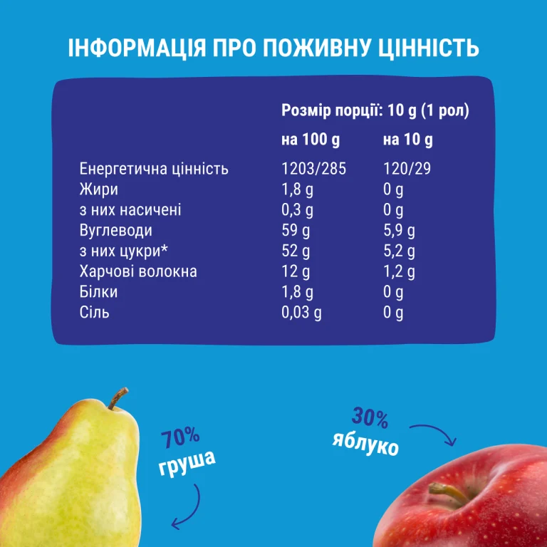 • два фруктові роли яблуко-груша (без доданого цукру, консервантів і барвників);